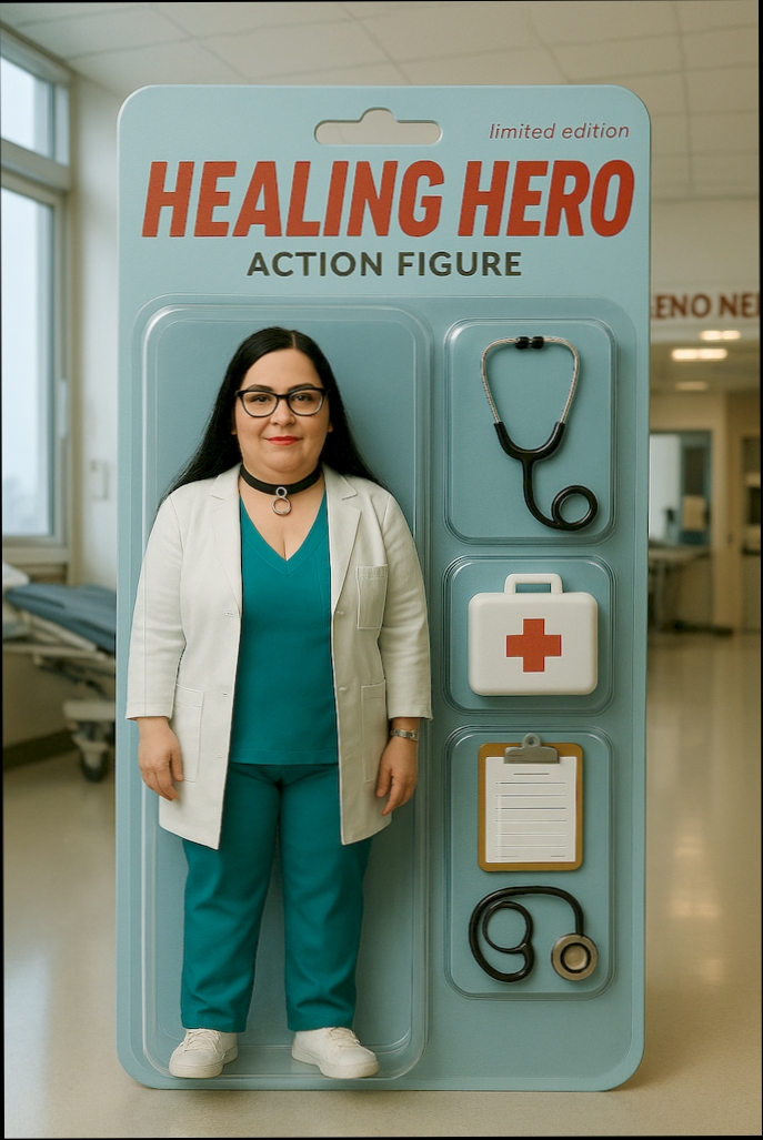 Als „Healing Hero“ trage ich ein Stethoskop, stehe vor einer Notaufnahme, bin fokussiert und präsent – ein Bild meiner Fürsorglichkeit und Stärke.
