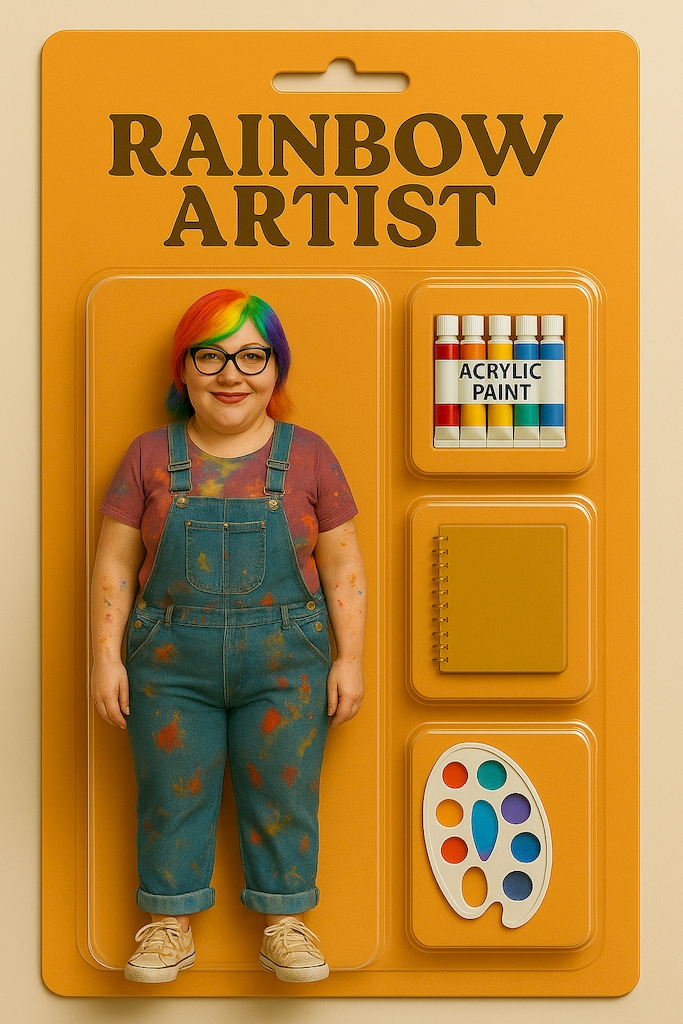 Ich finde es faszinierend, dass diese Bilder aus einem Zusammenspiel von Text und Technik entstehen. Ich beschreibe, wer ich bin – in präziser Sprache, mit klarer Vorstellung. Die KI visualisiert das, und plötzlich steht da: Ich. In Plastik. In einer Vision. In einer Box, die sagt: Du bist wertvoll. Du bist sammelbar. Du bist du.